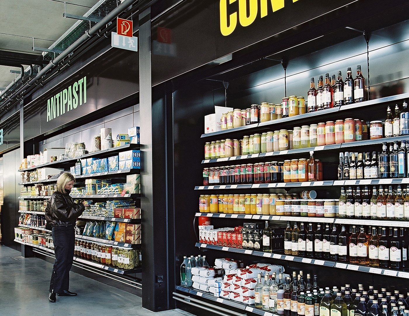 Die Rückwand des Marktraums wird durch verschiedene Warennischen gegliedert, die an die Bestandshalle angrenzen. Von den Nischen führt der Weg durch eine Glastür in die bestehenden Kühl- und Lagerräume. So kann die Ware von der Kommissionierungsseite bestückt und von der Kundenseite entnommen werden. Zur Differenzierung der Warengruppen wird die Farbgestaltung des bestehenden 70er-Jahre-Areals in den Warennischen und bei den freistehenden Verkaufsmöbeln fortgeführt. Dies erleichtert dem Kunden die Orientierung.