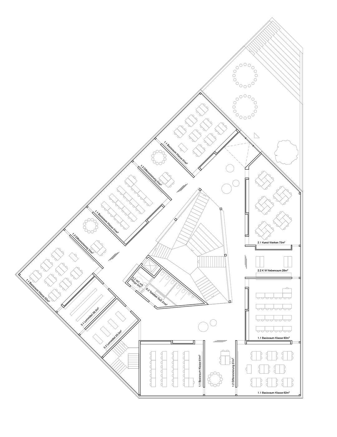 Unterrichts- und Fachbereiche im Obergeschoss. Ein zweigeschossiger Luftraum verbindet die beiden ringförmig organisierten Ebenen durch eine funktionsträchtige Treppenskulptur. Typologisch basiert der Lern- und Unterrichtsbereich auf einem ‚Klassenraum plus’ Prinzip, deren regelmäßige modulare Grundstruktur einfach auf veränderte funktionale Anforderungen angepasst werden kann. Ein spannungsvoller Umlauf, mit mehrfach direktem und indirektem Außenbezug, erschließt die teilverglasten Differenzierungs- und Unterrichtsräume, welche ebenfalls an der Fassade untereinander verbunden sind. Unmittelbar an den Umlauf und Kunstraum gebunden, bereichert eine großzügige Außenterrasse zum See die Lehrmöglichkeiten. Die gemeinschaftlichen Räume Multifunktionsraum, Mensa und Foyer sind als zusammenhängende Raumabfolge mit Wechselwirkung angelegt.
