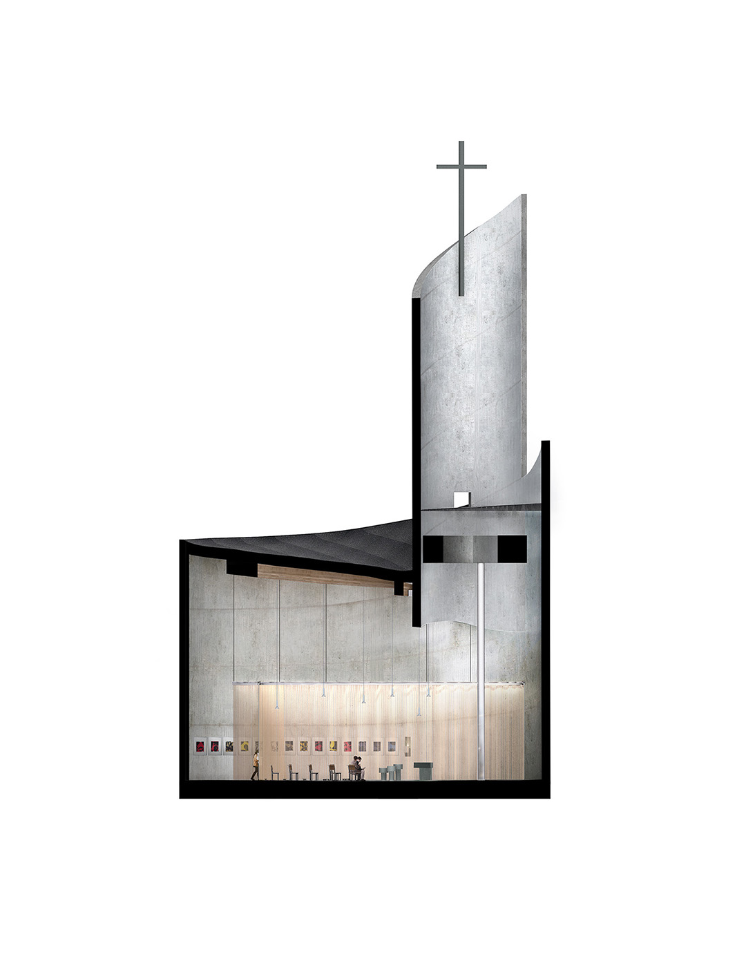 Der vielschichtige Funktionskatalog des Einbaus für soziale Einrichtungen wird dieser Idee folgend von einer vorgelagerten, unbeheizten Erschließungszone zusammengebunden, welcher, als Schalt- und Schnittstelle zwischen alter und neuer Nutzung, eine besondere Bedeutung zukommt. Zwischen dieser neuen Raumkante und der Kapellenfigur entsteht, unter der alten ansteigenden Holzdecke, ein polygonaler Platz – die Plaza. Hier etabliert sich ein neuer öffentlicher (Innen)Raum, welcher von den feingliedrigen Oberflächen der Einbauten, vor allem aber von den prägnanten Materialien der bestehenden Mauerwerks- und Betonwänden, geprägt ist. An diesem Ort der Begegnung und des Austausches wird die ursprüngliche spirituelle Atmosphäre der Kirche erfahrbar und ein selbstverständliches Nebeneinander von sakralen und weltlichen Funktionen ermöglicht.